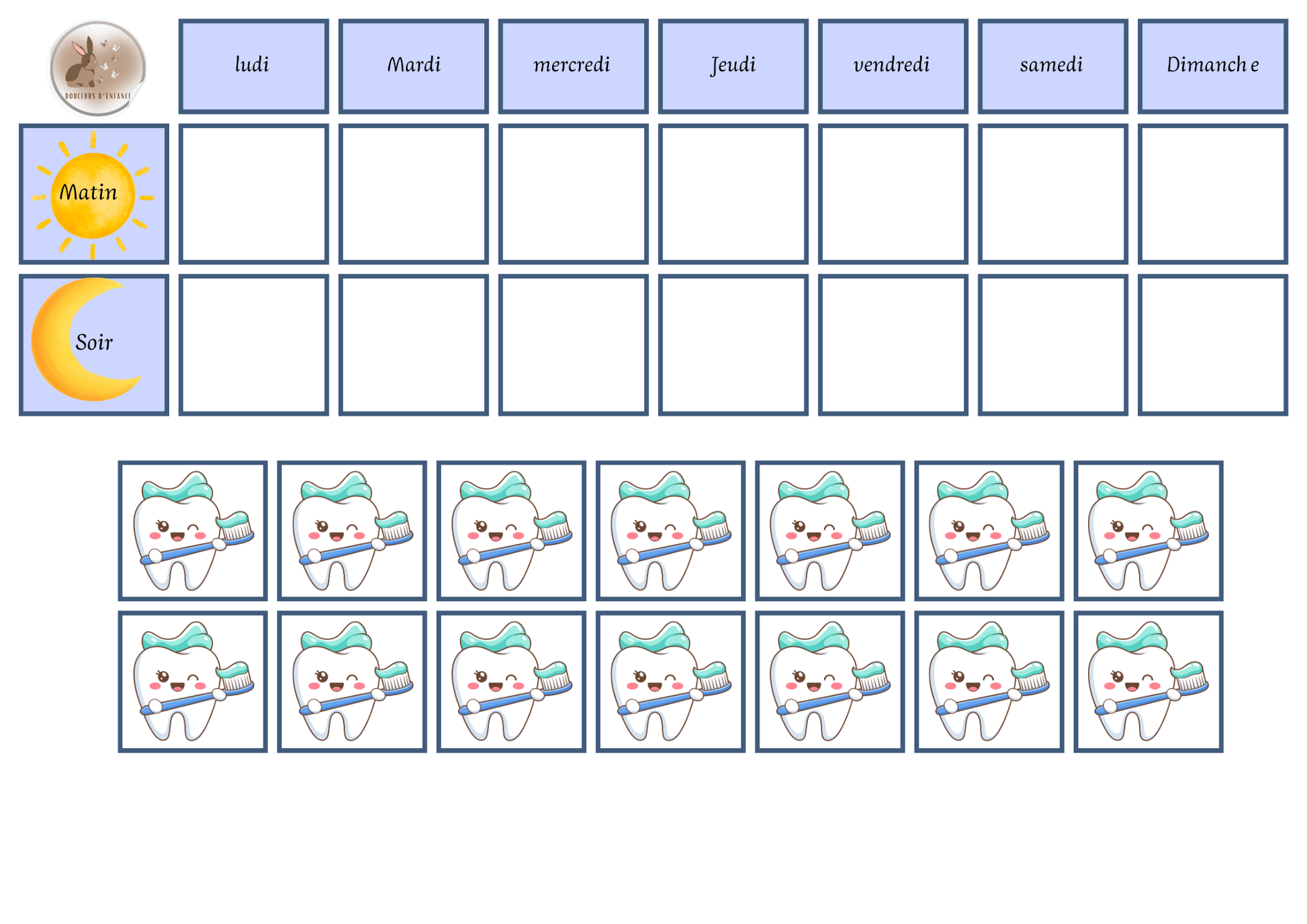 3 Un support avec le jour de la semaine matin et soir pour Visualiser le brossage des dents.